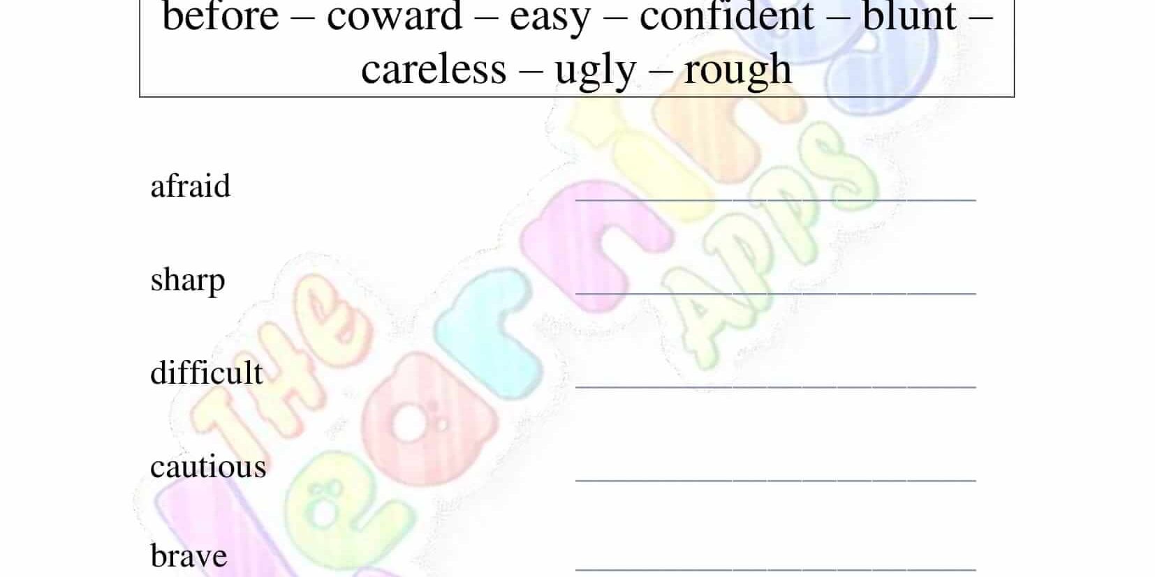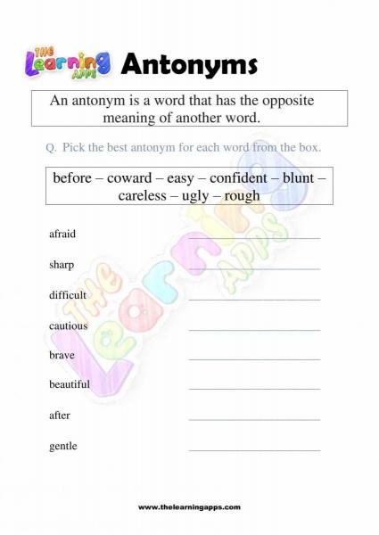 Views: 1,994 Coming soon.. Antonyms Grade 1 Worksheet 03 View All Activities Here you will have an educational and free printable Antonyms Grade 1 Worksheet for kids. By doing these worksheets, kids will learn about Antonyms in a fun and interactive way. Hit the download button and let the learning begin! Download View Category Antonyms Subject English Share This Related PostsAntonyms Grade 1 Worksheet 10August 16, 2022Antonyms Grade 1 Worksheet 09August 16, 2022Antonyms Grade 1 Worksheet 08August 16, 2022Antonyms Grade 1 Worksheet 07August 16, 2022Antonyms Grade 1 Worksheet 06August 16, 2022Antonyms Grade 1 Worksheet 05August 16, 2022