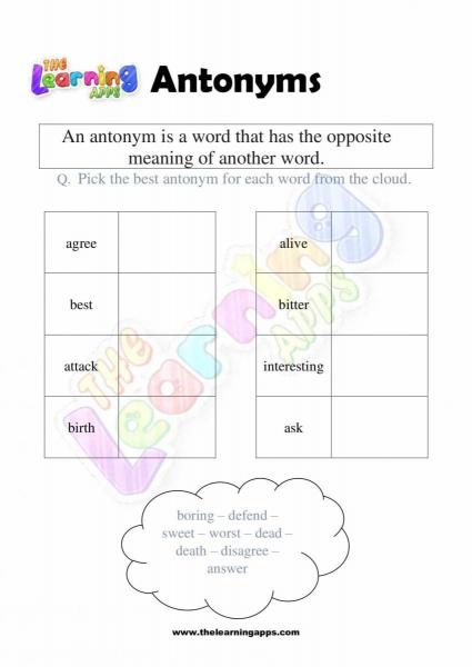 Views: 1,977 Coming soon.. Antonyms Grade 1 Worksheet 10 View All Activities Here you will have an educational and free printable Antonyms Grade 1 Worksheet for kids. By doing these worksheets, kids will learn about Antonyms in a fun and interactive way. Hit the download button and let the learning begin! Download View Category Antonyms Subject English Share This Related PostsAntonyms Grade 1 Worksheet 09August 16, 2022Antonyms Grade 1 Worksheet 08August 16, 2022Antonyms Grade 1 Worksheet 07August 16, 2022Antonyms Grade 1 Worksheet 06August 16, 2022Antonyms Grade 1 Worksheet 05August 16, 2022Antonyms Grade 1 Worksheet 04August 16, 2022
