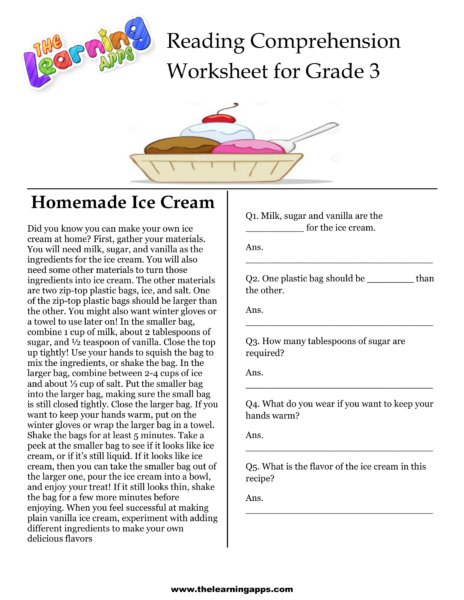 Download our free printable comprehension worksheets for grade 3. The Homemade Ice Cream Comprehension Worksheet is one of the best way to engage your child in learning.