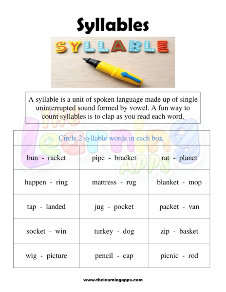 Download this Syllable Worksheet 06 for students to improve their literacy while having fun at home or in the classroom. By breaking words down into manageable syllables, your kid will enjoy building a solid foundation for their language improvement.